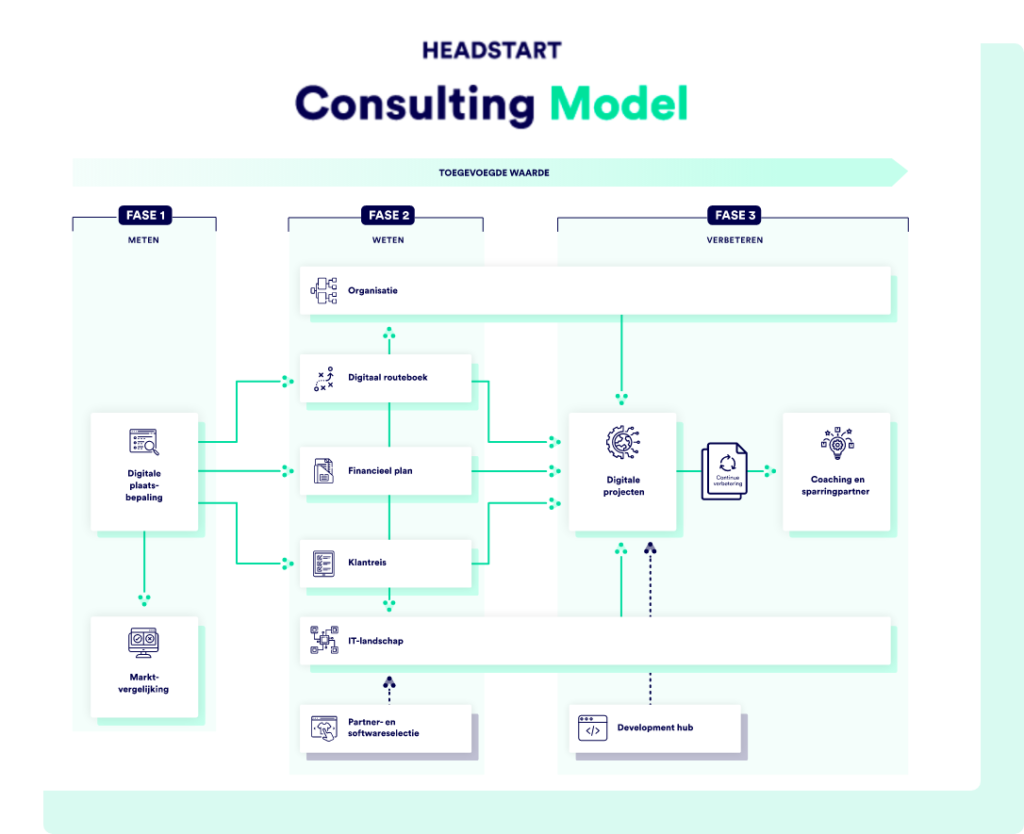 Een digitale transformatie onderga je niet van de ene op de andere dag. Dat vraagt om een zorgvuldige aanpak en begeleiding. SCAPE heeft hiervoor een eigen methode ontwikkeld: het Headstart Consulting Model. Lees meer over de manier waarop we samen succesvol voor je gaan worden.